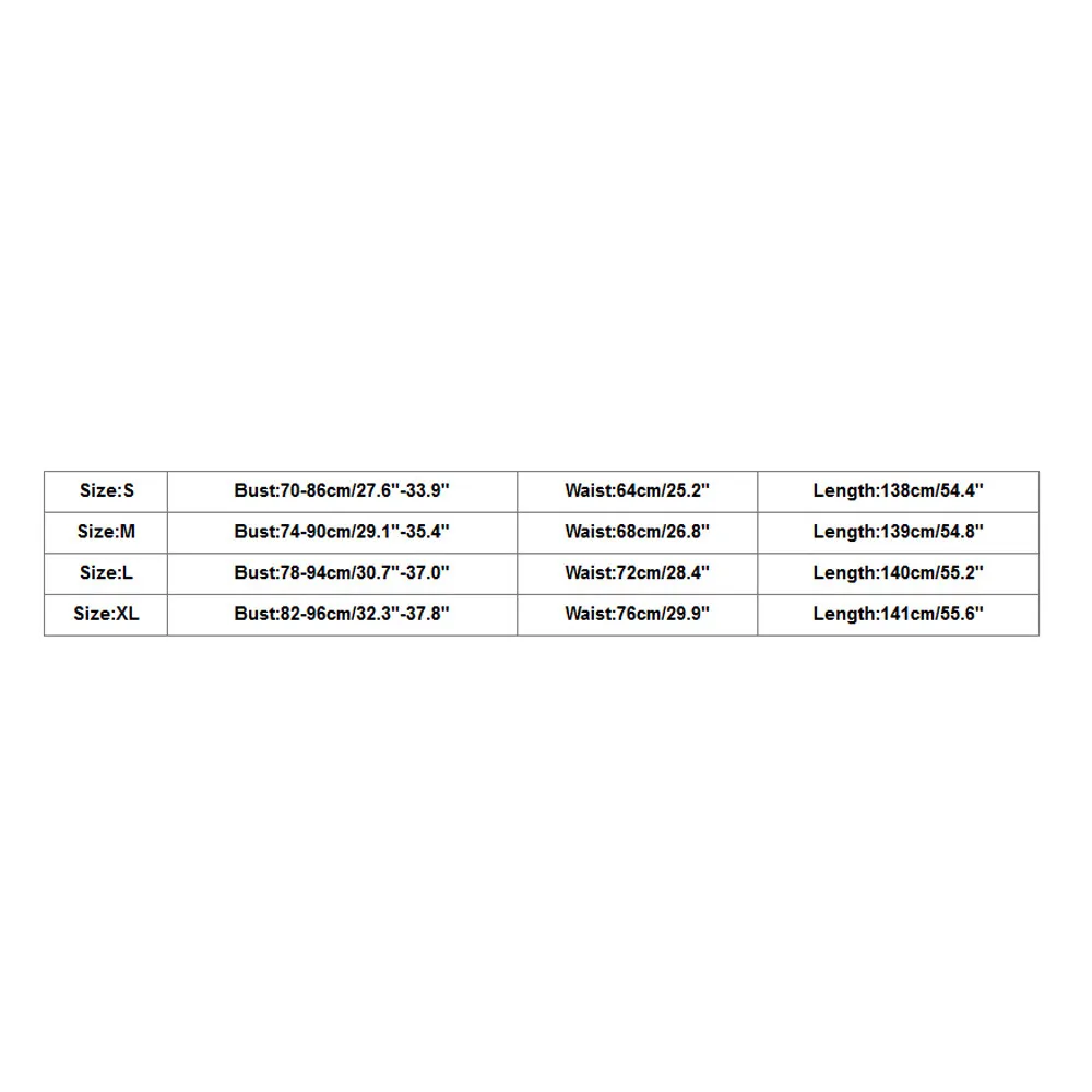 | Size:S | Bust:70-86cm/27.6"-33.9" | Waist:64cm/25.2" | Length:138cm/54.4" |
